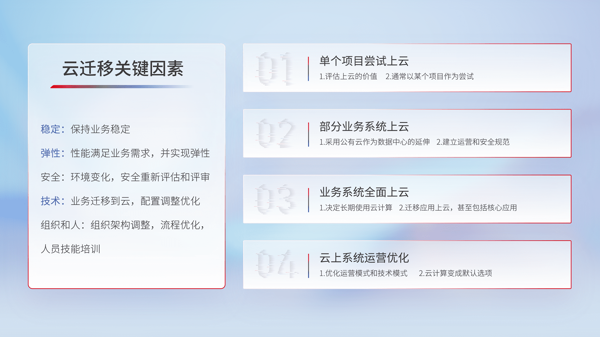 结合实际业务,,,,从规划设计、、、、云平台选型、、、云原生改造、、数据迁移、、、、集成交付,,,迁移全过程为客户识别最佳上云路径,,,做好风险识别管理,,,,设计网络架构、、身份权限、、安全审计合规、、、、操作审计、、日志审计、、、监控告警策略、、、多站点容灾设计等,,,对云上基础设施进行整体规划,,提升IT治理水平,,,以满足弹性、、高可用、、、高性能的需求。。