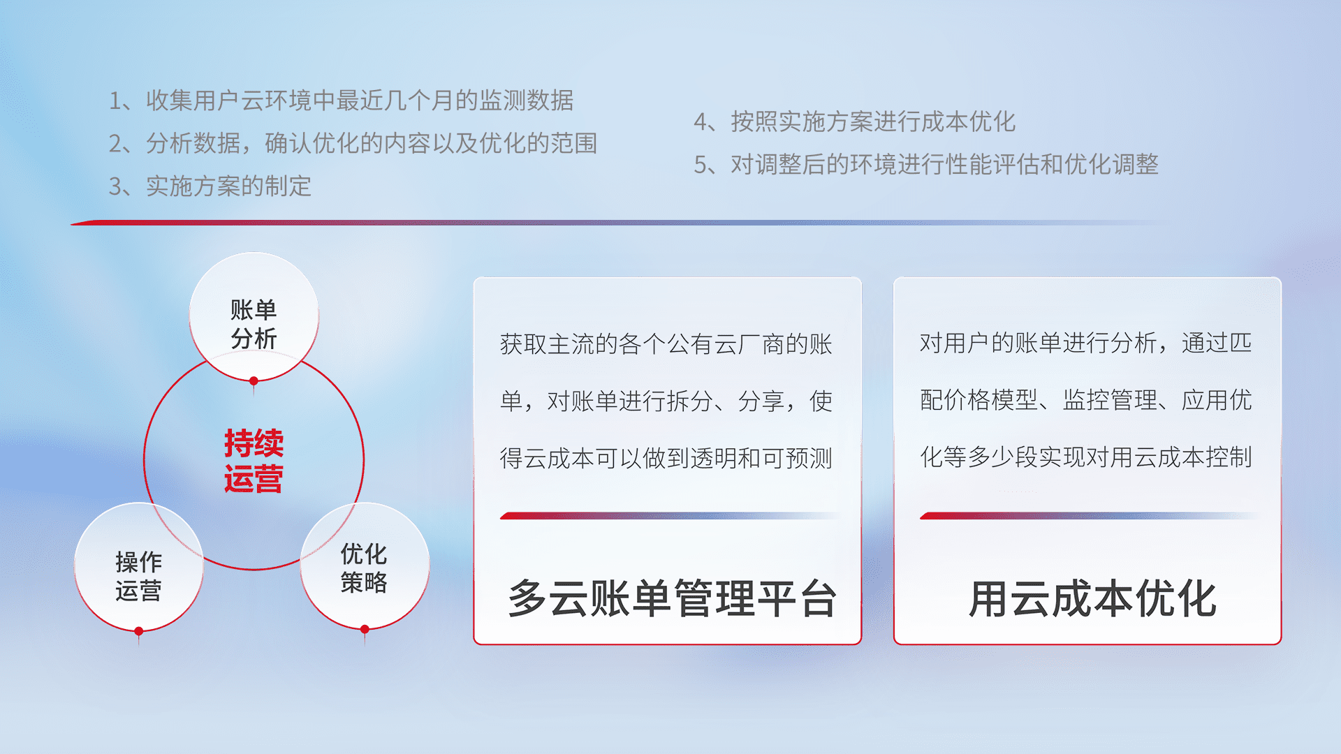 通过多云纳管,,,,以统一的资源数据模型把客户的云资源进行抽象和封装,,进而实现对多云资源的统一操作,,保障云资源管理的可靠性、、稳定性与可用性。。。量身定制化运维内容,,,,配置、、开发运维、、、补丁管理、、备份、、监控、、、、认证和访问管理、、、、审计和日常巡检等,,,保障在用云过程中的可靠度,,稳定度以及高可用率。。。